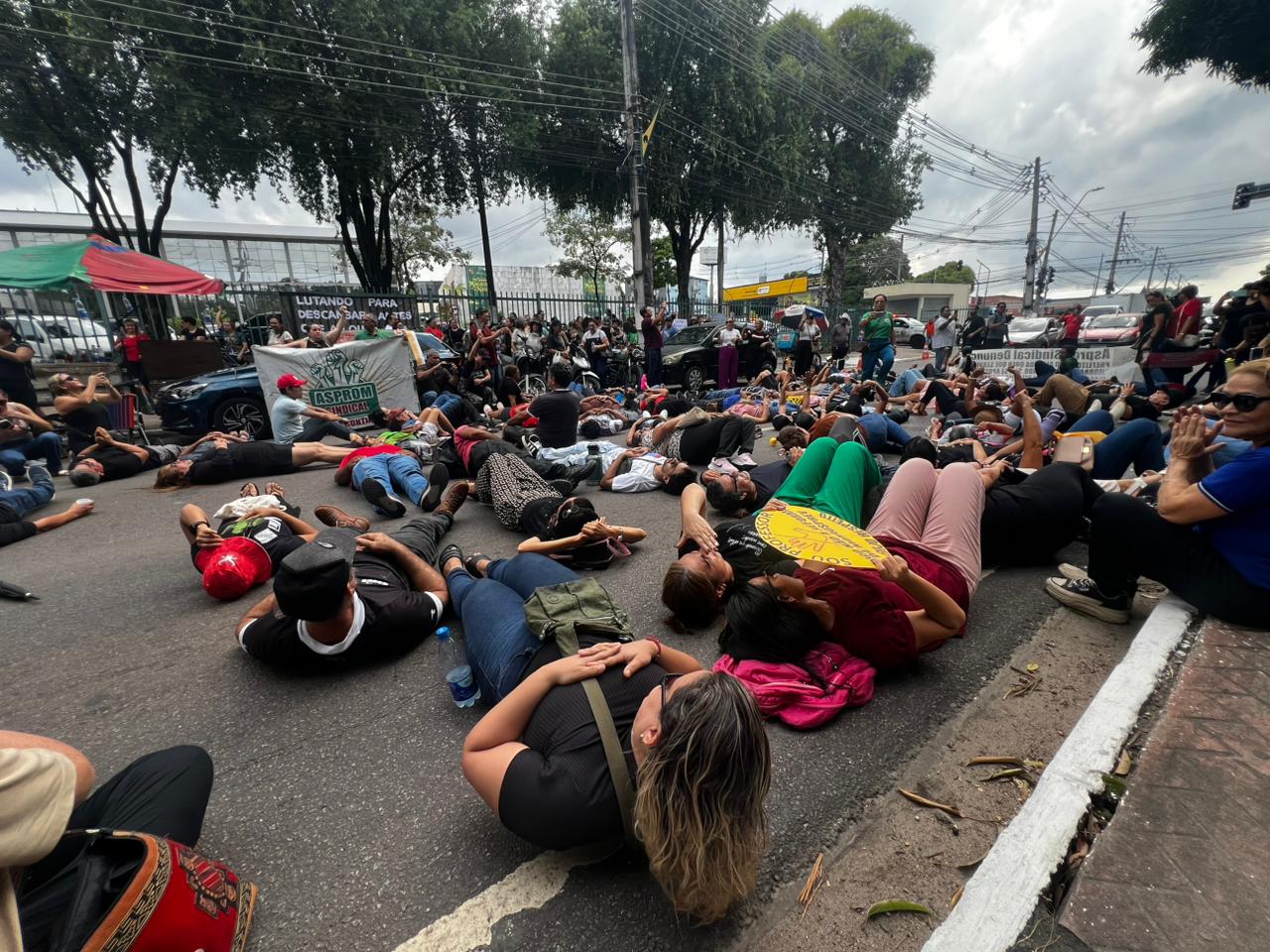 MANAUS – Professores e membros do Asprom Sindical protestaram nesta terça-feira (18) em frente à Prefeitura de Manaus contra o Projeto de Lei Complementar (PLC) nº 8/2025, apelidado de “PL da Morte” pelos manifestantes. Durante o ato, educadores chegaram a deitar-se no chão, simbolizando o impacto negativo que, segundo eles, a proposta trará aos servidores da educação. A manifestação também interrompeu brevemente o tráfego na área.
